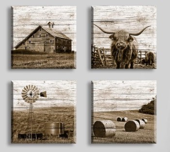 Farmhouse canvas wall art featuring a rustic countryside landscape with an old barn and windmill. Framed, ready to hang, and includes three 12" × 16" panels—perfect for bedroom or living room décor