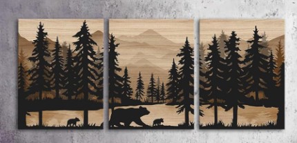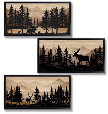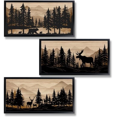 Bring the beauty of the forest indoors with this WELMECO cabin wall art set. Showcasing bear, moose, and deer artwork, these rustic farmhouse pieces are framed in black with rich brown tones. The three 8" × 16" panels are ideal for living rooms, bedrooms, or bathrooms