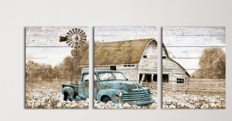 Bring peaceful country charm into your space with this framed farmhouse wall art. Showcasing a countryside scene with an old barn and windmill, this teal-toned rustic canvas set comes ready to hang and includes three 12" × 16" panels for a balanced display